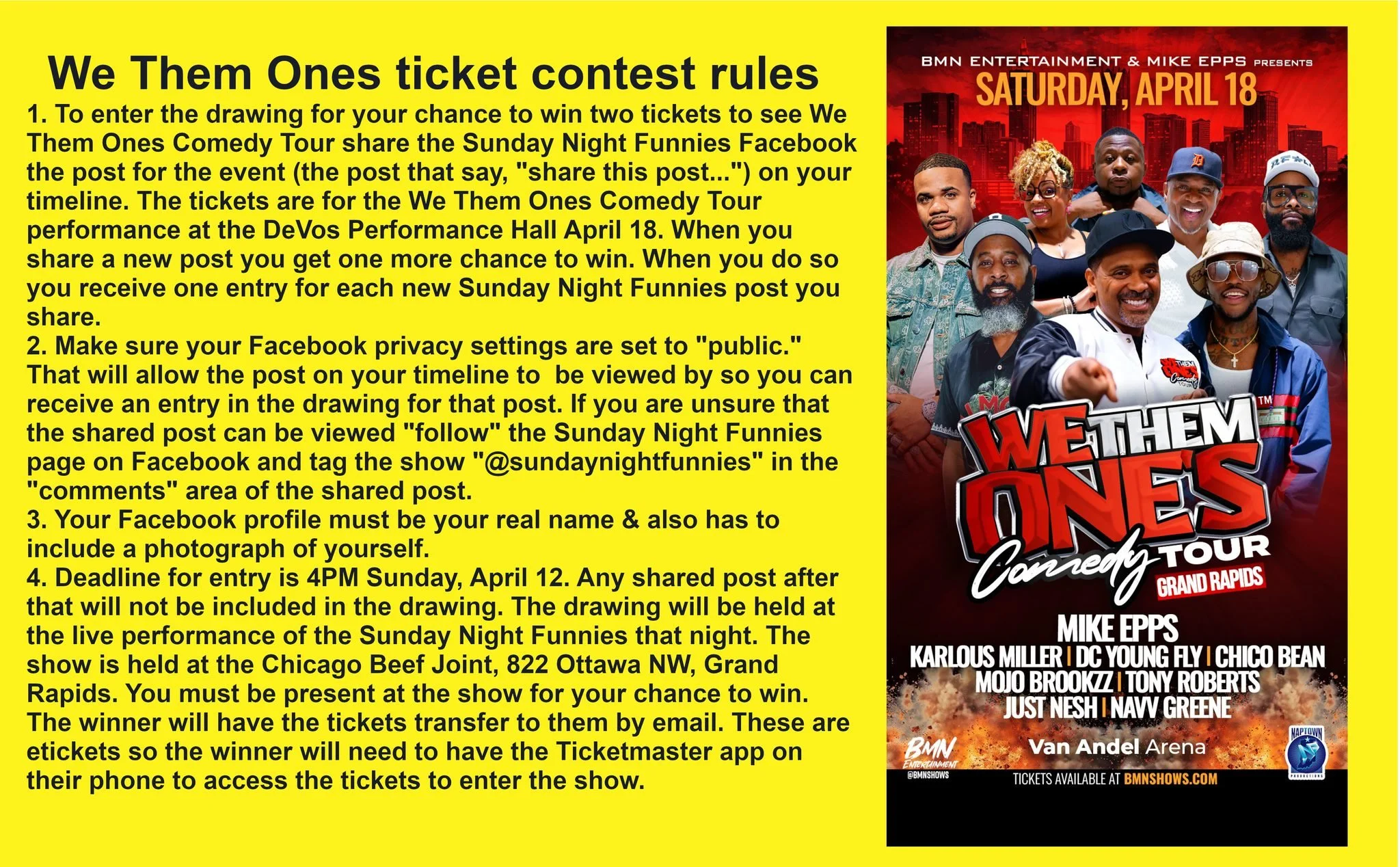 Come out to the Sunday Night Funnies this weekend. Besides a great night of comedy that night we'll have a pair of tickets to giveaway to see the We Them Ones featuring Mike Epps, Karlous Miller, DC Young Fly, Chico Bean, Mojo Brookzz, Tony Roberts, TK Kirkland, Just Nesh, Fab Monroe, Jayski, and Navv Greene (lineup varies per city.)